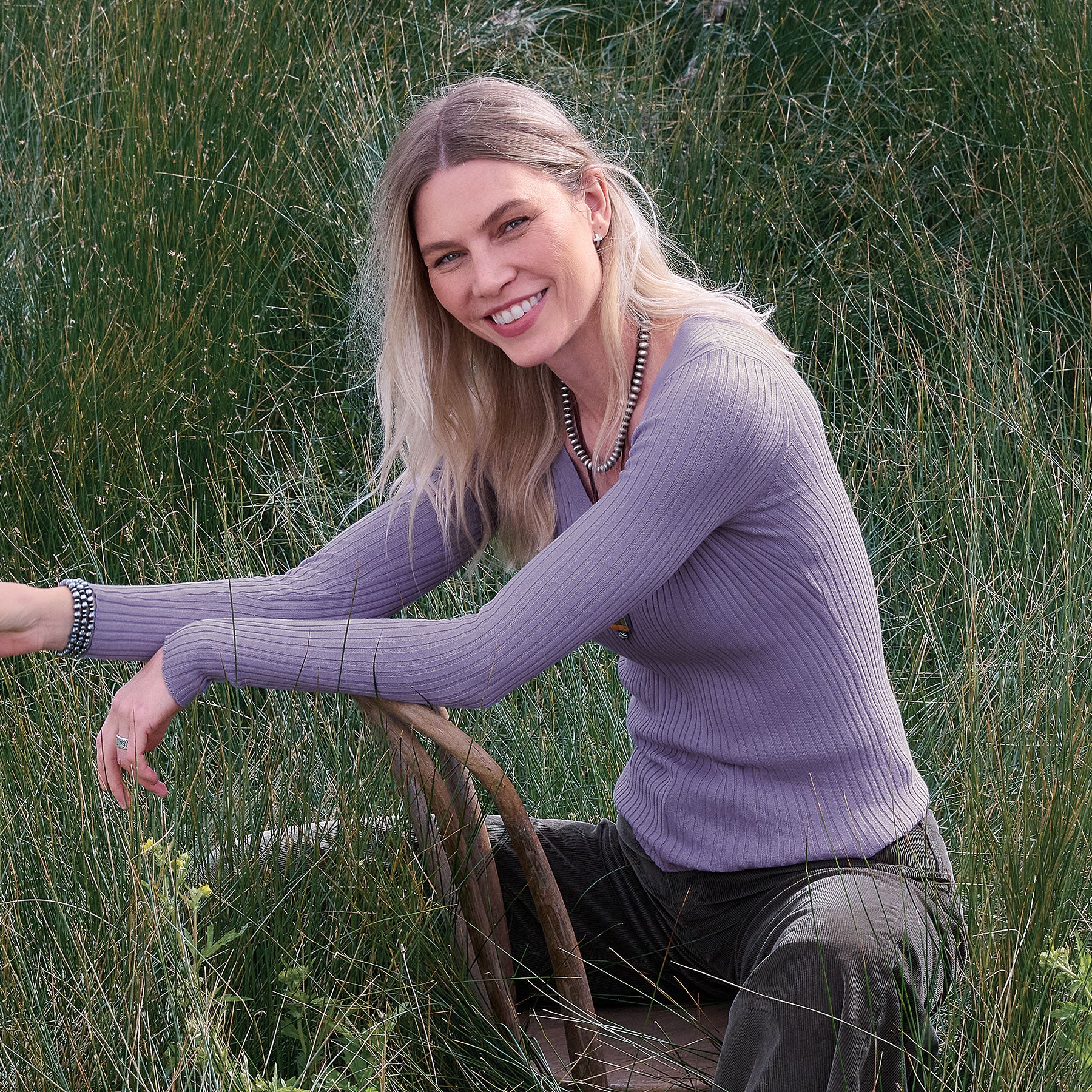 Simple and sophisticated. our fitted. mixed rib stitch sweater. in Lightest Legends yarn. V-neck. Cotton/nylon/spandex. Machine wash. Imported. Exclusive. Sizes XS (0–2). S (4–6). M (8–10). L (12–14). XL (16–18). XXL (20–22). Approx. 24l.
