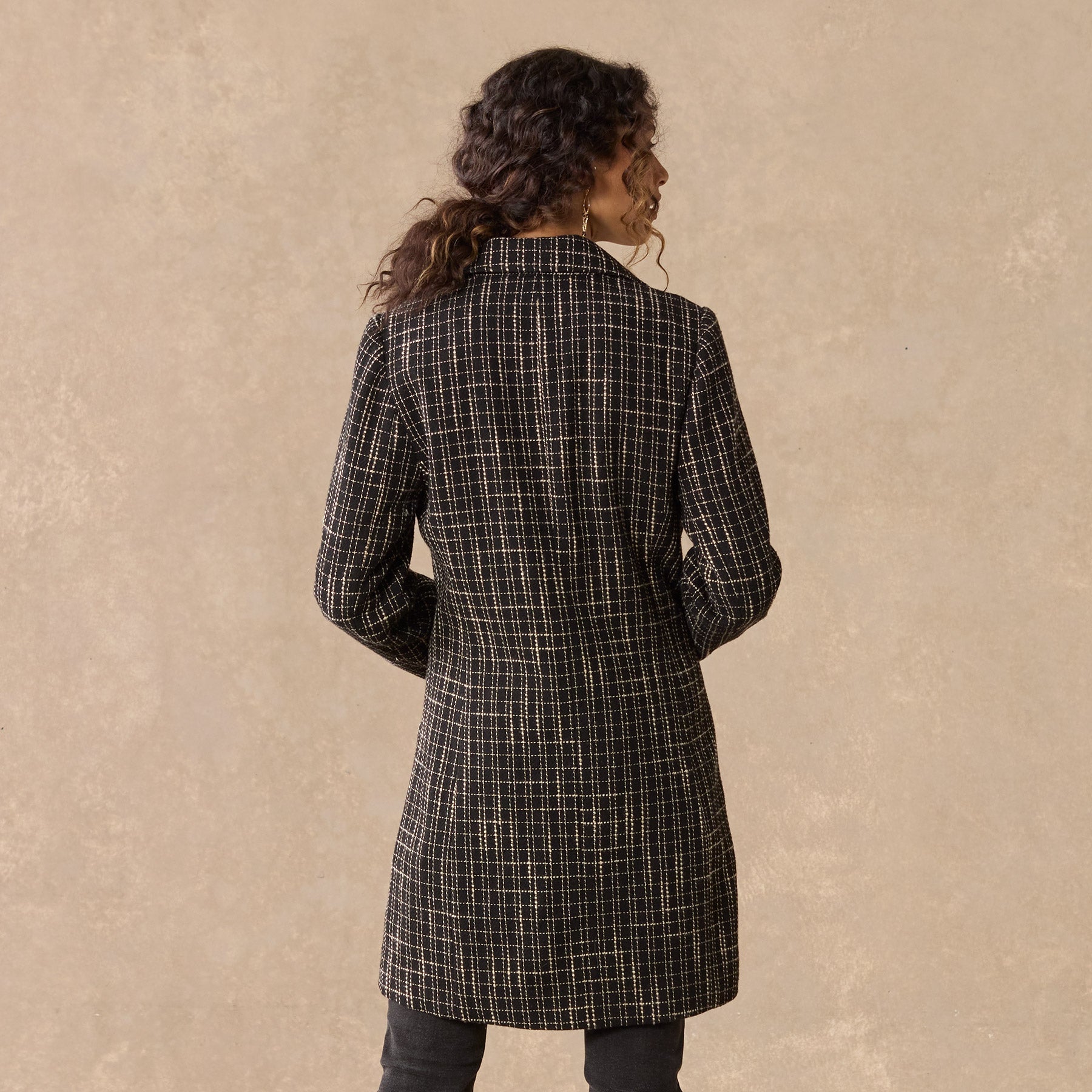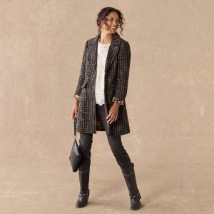 Our ladylike coat is slightly fitted. in a slubby plaid. with three-button closure. flap pockets and a standout floral lining. Soft and comfortable. midi-length. with a nice A-line shape. Wool/polyester. Dry clean. Imported. Exclusive. Sizes XXS (00). XS (0–2). S (4–6). M (8–10). L (12–14). XL (16–18). Approx. 35l.