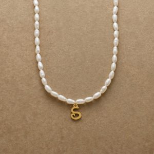 A letter-perfect example of everyday elegance. this string of freshwater pearls can be customized with a script alphabet charm. Charm and lobster clasp made of 14kt gold-plated stainless steel. Handcrafted with silk cord. USA. 15??6 1/2l.