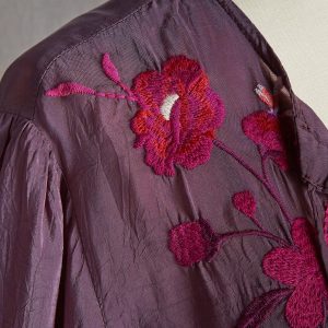 This beautiful. rayon georgette shift dress is a head-turner. with deep. saturated color. lush floral embroidery. V-neck with beaded tassel ties and three-quarter elastic sleeves. Dry clean. Imported. Sundance exclusive. Sizes XS (4). S (6). M (8-10). L (12). XL (14). XXL (16). Approx. 37.5l.