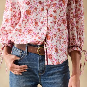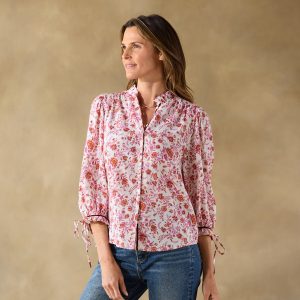 So easy—our feminine top is as beautiful as it is relaxed with button-down front. ruffle details at the neckline and bracelet length cuffs. contrast velvet trim and two lovely rows of smocking. Adjustable ties at the cuffs. Cotton. Machine wash. Imported. Exclusive. Sizes XS (0–2). S (4–6). M (8–10). L (12–14). XL (16–18). XXL (20–22). Approx. 25l.