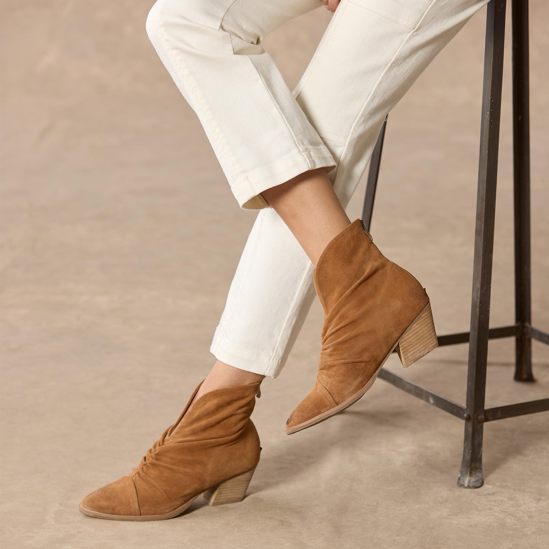 Soft ruching is the highlight of these handcrafted boots with an almond toe. open front and back zipper. Leather lined. Suede. Imported. Whole sizes 36 (US 5). 37 (US 6). 38 (US 7). 39 (US 8). 40 (US 9). 41 (US 10). 2 heel.