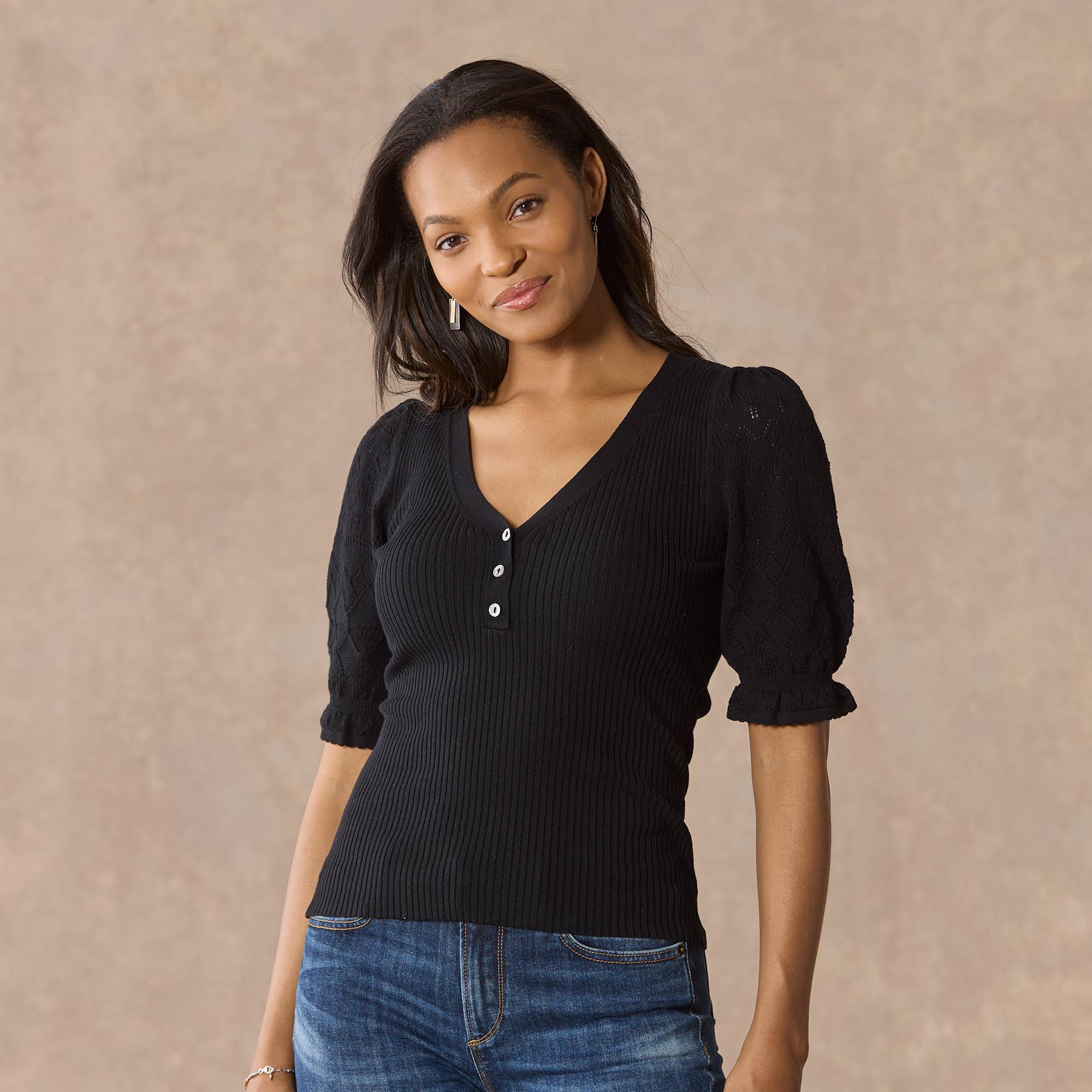 Experience the essence of luxury in our feminine and fitted V-neck henley. so soft in our Legends Lightweight Yarn. Beautiful pointelle at the bold puff sleeves and special scalloped trim details add an extra touch of grace. Organic cotton/nylon/spandex. Machine wash. Imported. Exclusive. Sizes XXS (00). XS (0?C2). S (4?C6). M (8?C10). L (12?C14). XL (16?C18). Approx. 20.5l.