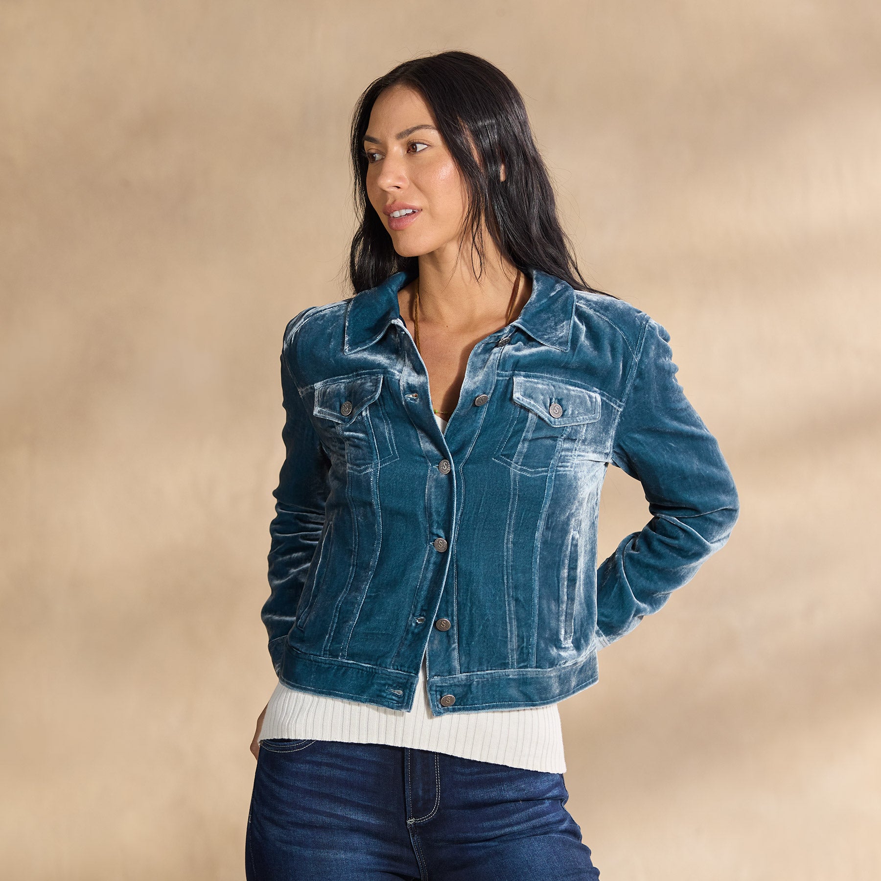 A classic jean jacket silhouette. but in soft. subtly shimmery velvet. Dress it up or down. Fully lined. Four pockets. Viscose/silk. Dry clean. Imported. Exclusive. Sizes XXS (00). XS (0–2). S (4–6). M (8–10). L (12–14). XL (16–18). Approx. 20l.